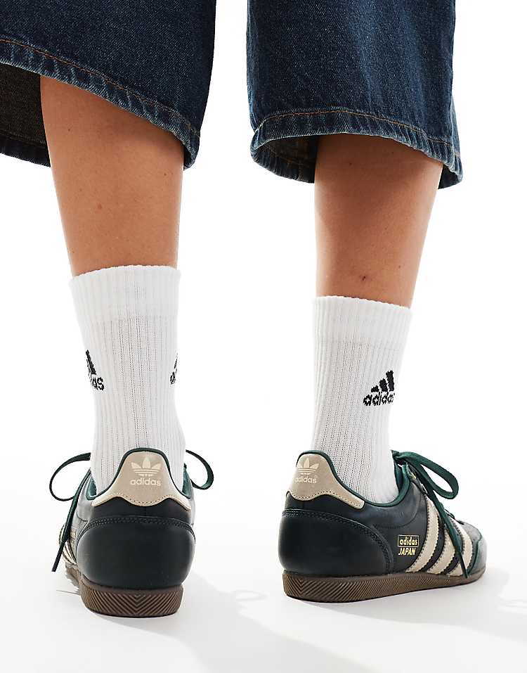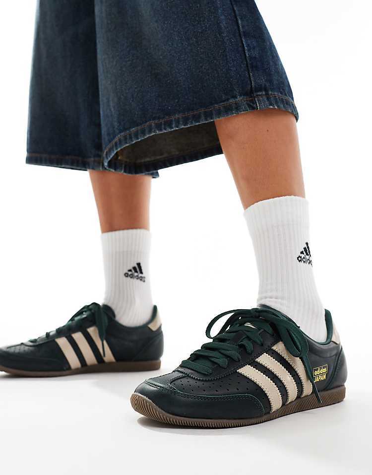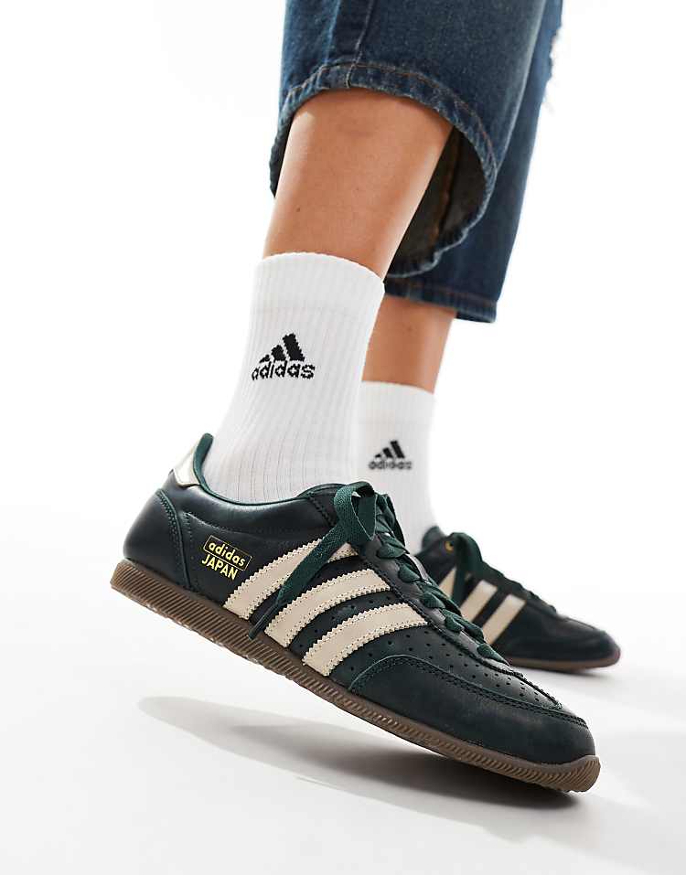 Адидас Джапан кроссовки низкие темно-зеленые из натуральной кожи с перфорацией и фирменным логотипом.