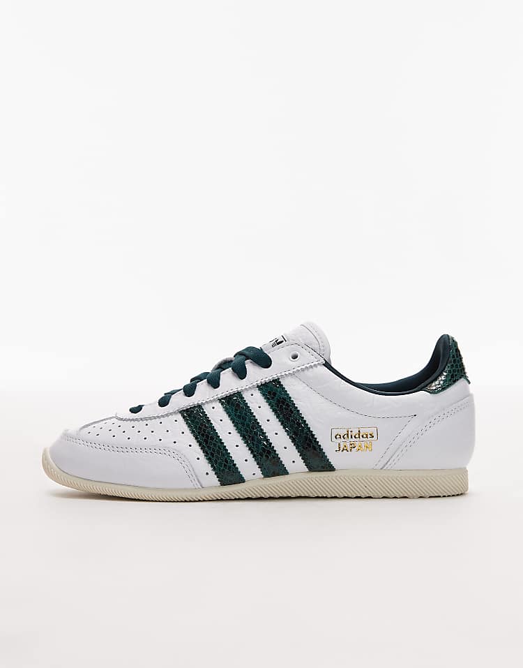Белые женские кроссовки adidas Originals модели Japan — это сочетание классического стиля и ярких деталей. Матовый верх из натуральной кожи обеспечивает долговечность и презентабельный вид, а декоративные вставки с эффектом питона тёмно-зелёного цвета добавляют образу дерзости. Эти кроссовки идеально впишутся в повседневный гардероб, став изюминкой любого образа — от джинсов до мини-юбок.