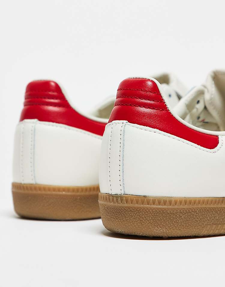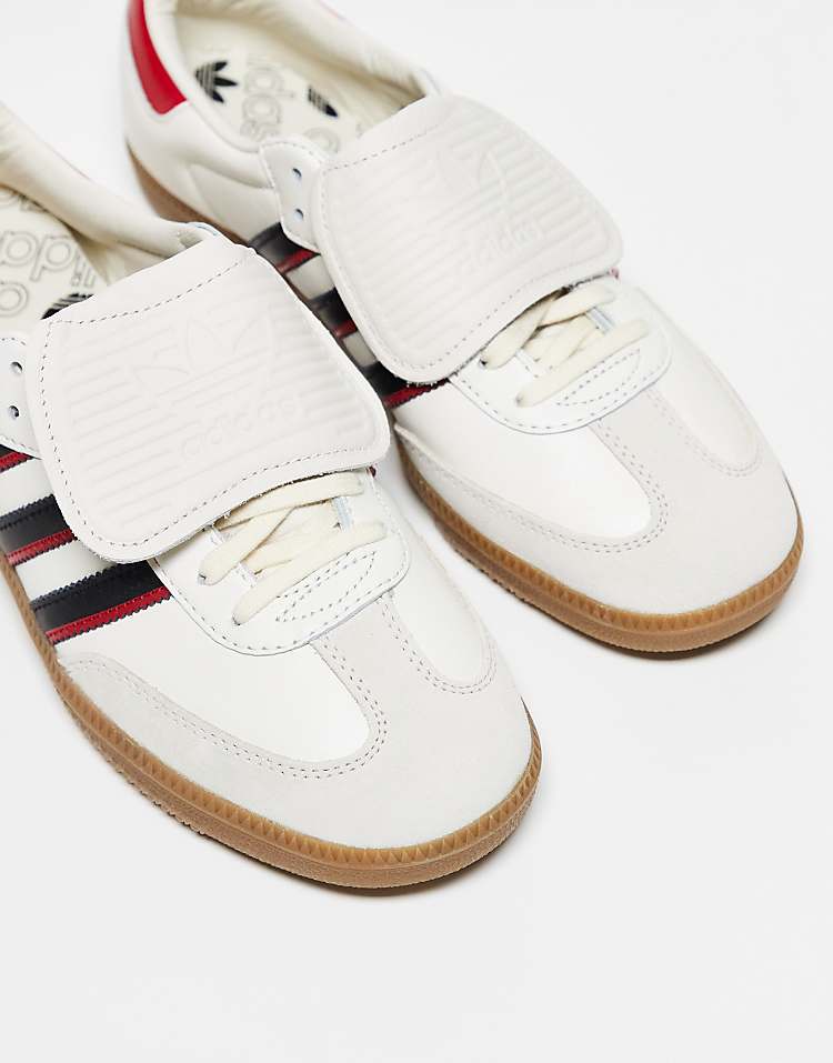 Адидас Самба LT кроссовки белые с кожаным верхом и красными вставками на пятке.