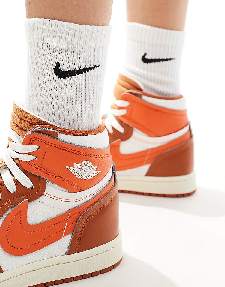 Джордан Эйр Джордан 1 высокие кроссовки белые с оранжевыми акцентами.
