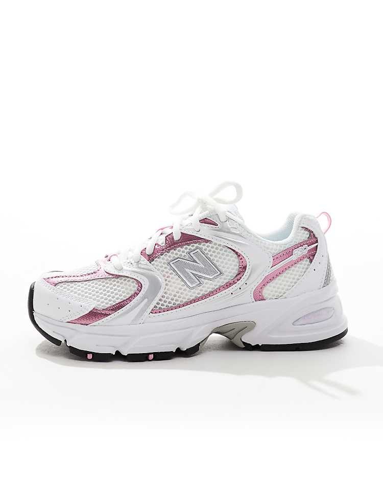 Нью Баланс 530 кроссовки белые повседневные с розовыми металлическими деталями.