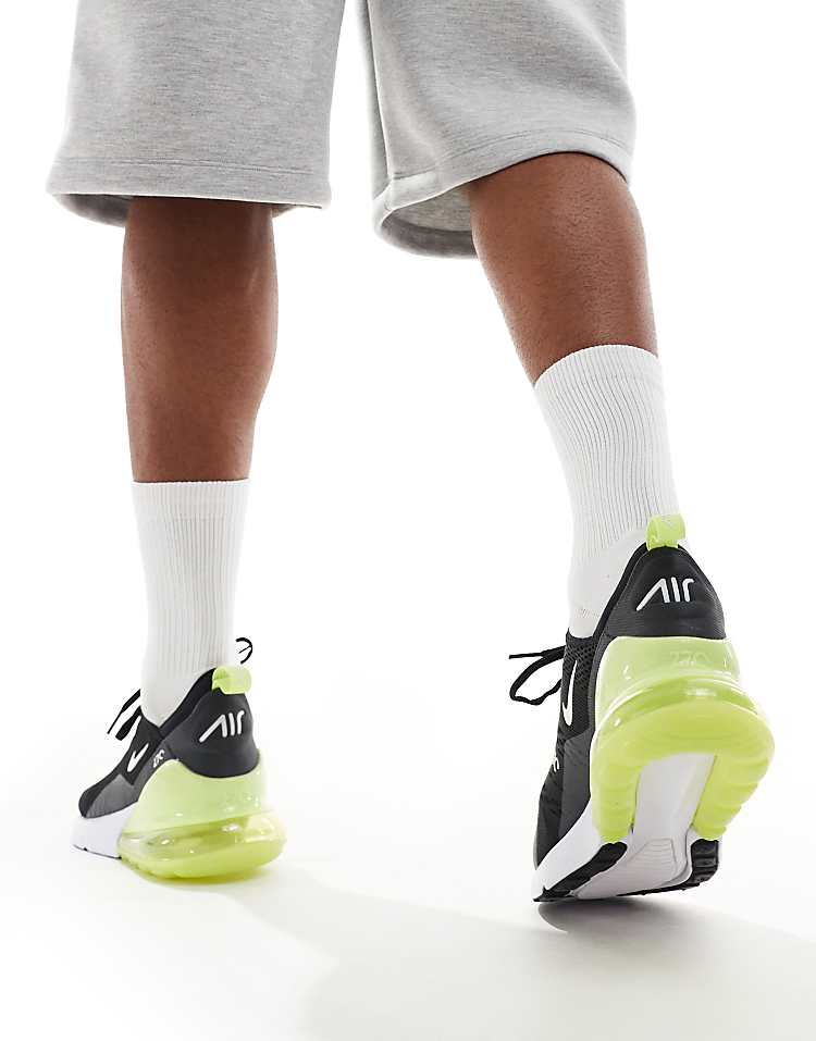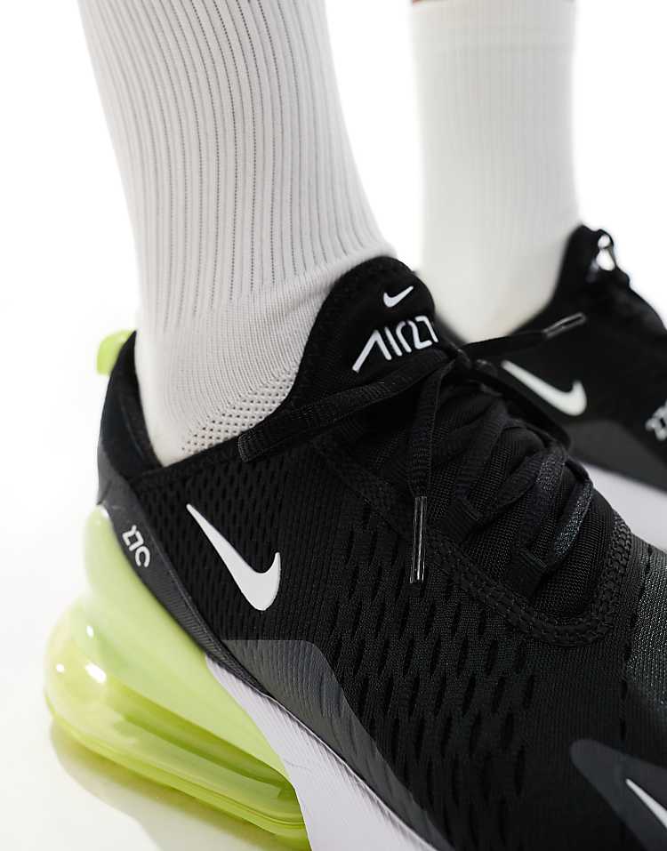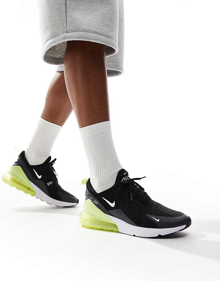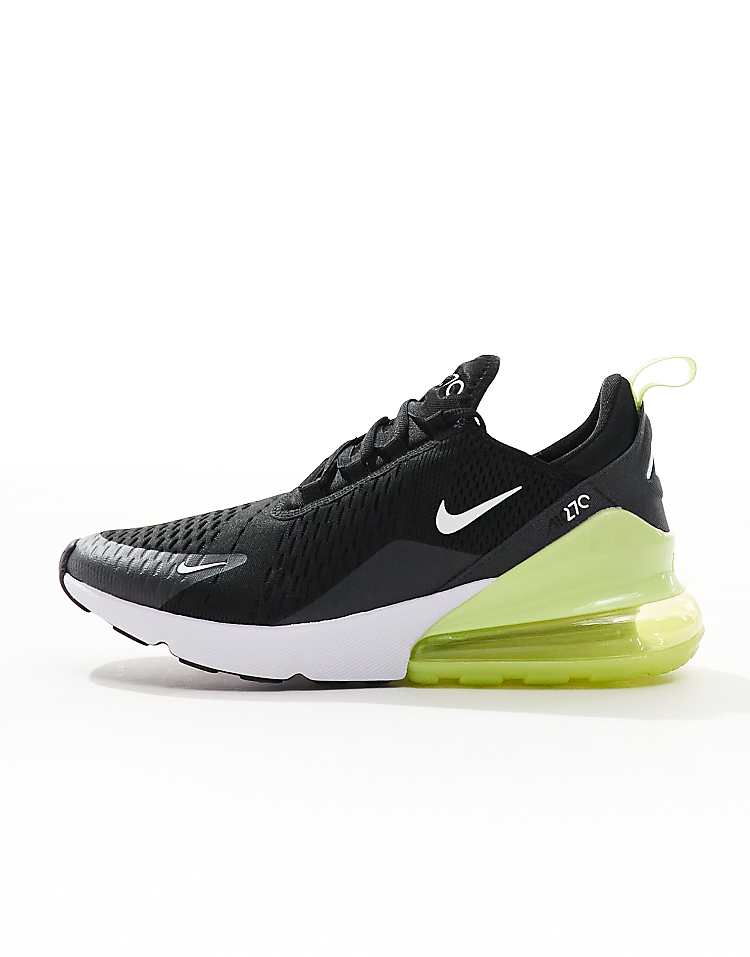 Классические мужские кроссовки Nike Air Max 270 сочетают в себе современный дизайн и передовые технологии, что делает их идеальным выбором для повседневной носки и активного образа жизни. Модель выполнена в лаконичной цветовой гамме — чёрный верх с акцентами зелёного цвета придаёт обуви спортивный и динамичный вид. Верх изготовлен из дышащего сетчатого материала, который обеспечивает комфорт и вентиляцию в течение всего дня. Эластичная внутренняя вставка и манжета, напоминающая носок, плотно фиксируют стопу, гарантируя надёжную посадку без дополнительных настроек.