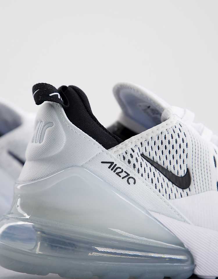 Каждая деталь этих женских кроссовок Nike Air Max 270 продумана для комфорта и стиля. Модель выполнена в классической цветовой гамме — белый верх с контрастными черными акцентами, что делает её универсальным решением для повседневного образа. Верх изготовлен из дышащего трикотажа, который плотно облегает стопу, обеспечивая ощущение носки «в носке». Практичная шнуровка и удобная петля на пятке упрощают надевание и фиксируют обувь во время движения.