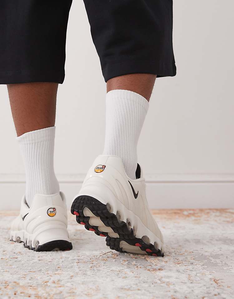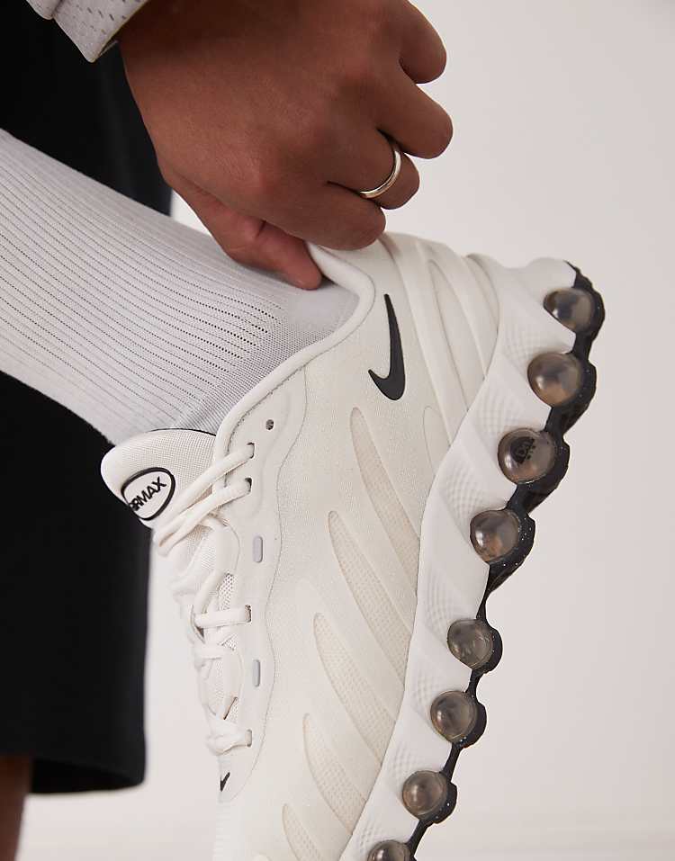 Кроссовки Nike Air Max DN8 — это сочетание современного дизайна и передовых технологий для комфортной носки каждый день. Модель выполнена в классическом off-white и чёрном цвете, что делает их универсальным выбором как для спортивного стиля, так и для повседневной носки в городе. Верх из прочного полиуретана и сетчатых вставок обеспечивает лёгкость и хорошую вентиляцию, а шнуровка гарантирует плотную посадку на стопе.