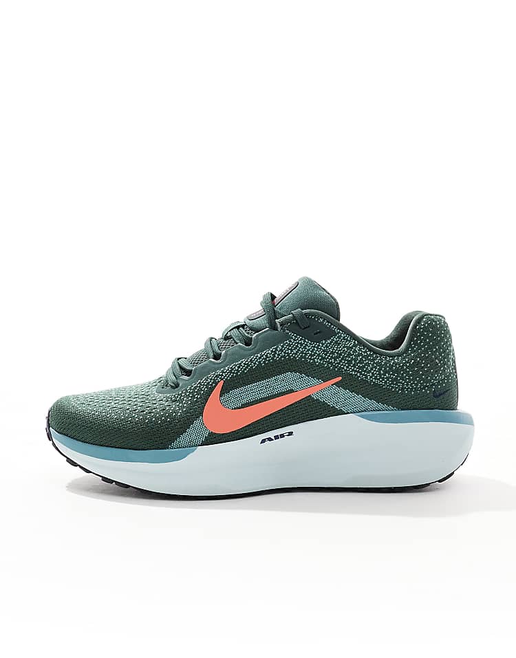 Найк Винфло 11 кроссовки для бега в темно-зеленом цвете с элементами оранжевого.
