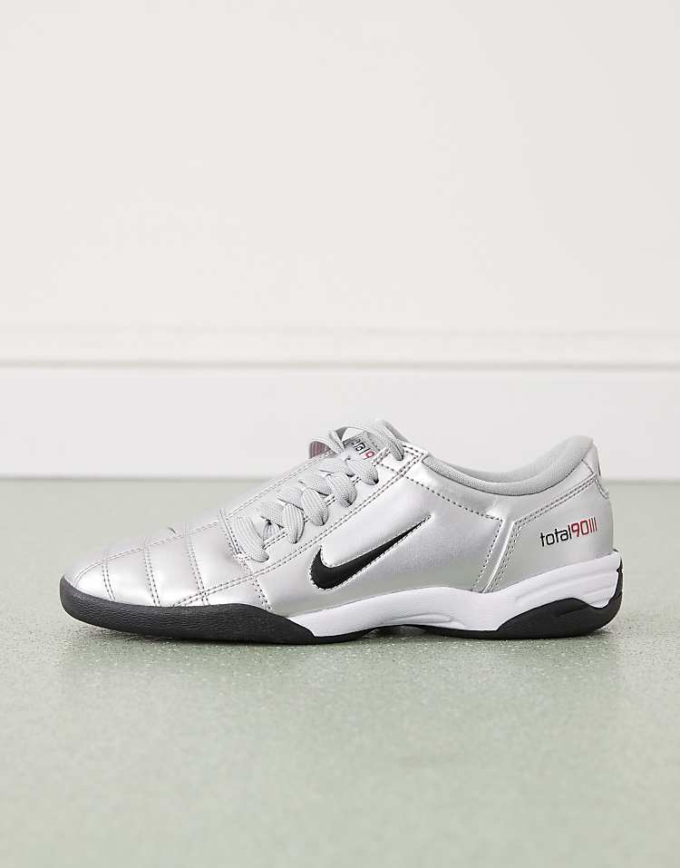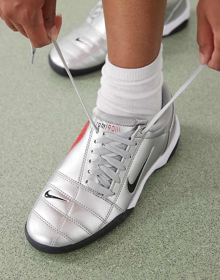 Найк Т90 кроссовки женские из металлизированной кожи с асимметричной шнуровкой и фирменным логотипом.