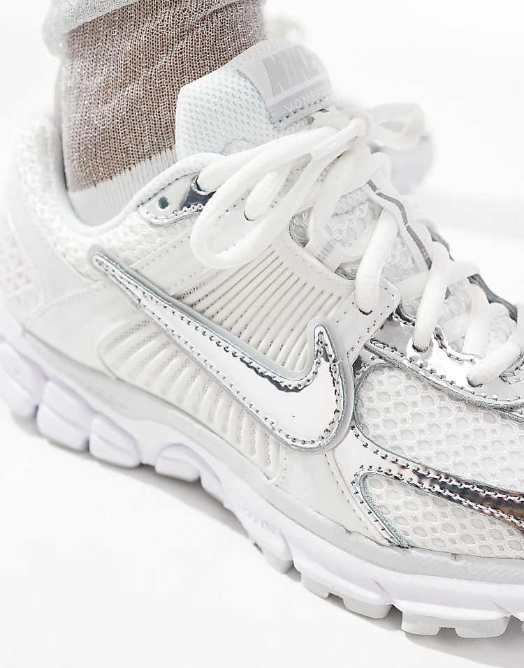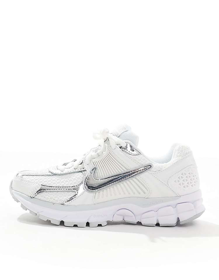 Кроссовки Nike Zoom Vomero 5 — это идеальное сочетание стиля и функциональности для повседневной носки и активного образа жизни. Модель выполнена в классическом белом цвете с эффектными металлическими вставками серебристого оттенка, придающими обуви современный, спортивный вид. Верхняя часть изготовлена из комбинации дышащей сетки и натуральной кожи, что обеспечивает комфорт, вентиляцию и долговечность. Усиленные вставки по бокам добавляют поддержку стопе, особенно при ходьбе или лёгком беге, делая эту модель популярной среди тех, кто ищет надёжные и стильные белые кроссовки для города.