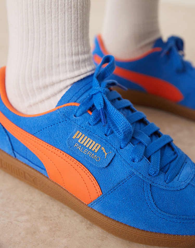 Пума Палермо кроссовки повседневные на резиновой подошве голубого цвета с оранжевыми акцентами.