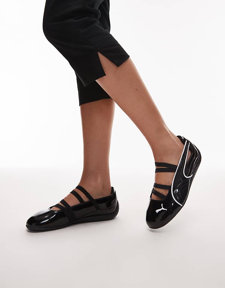 Пума Спидкат балетки глянцевые черные из натуральной кожи с эластичными ремешками и подошвой с протектором.