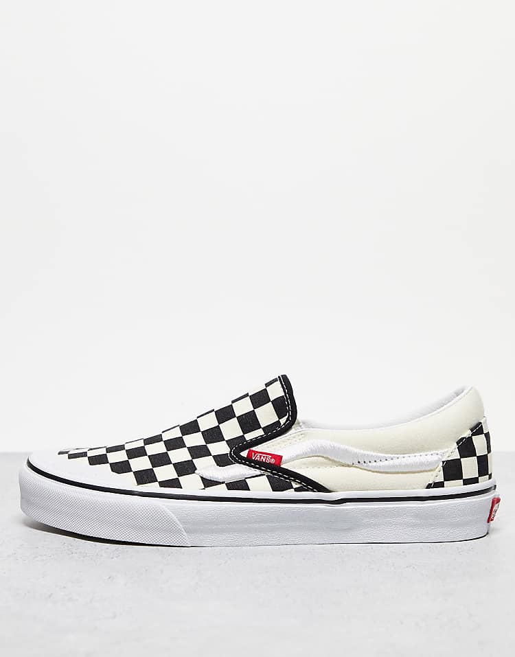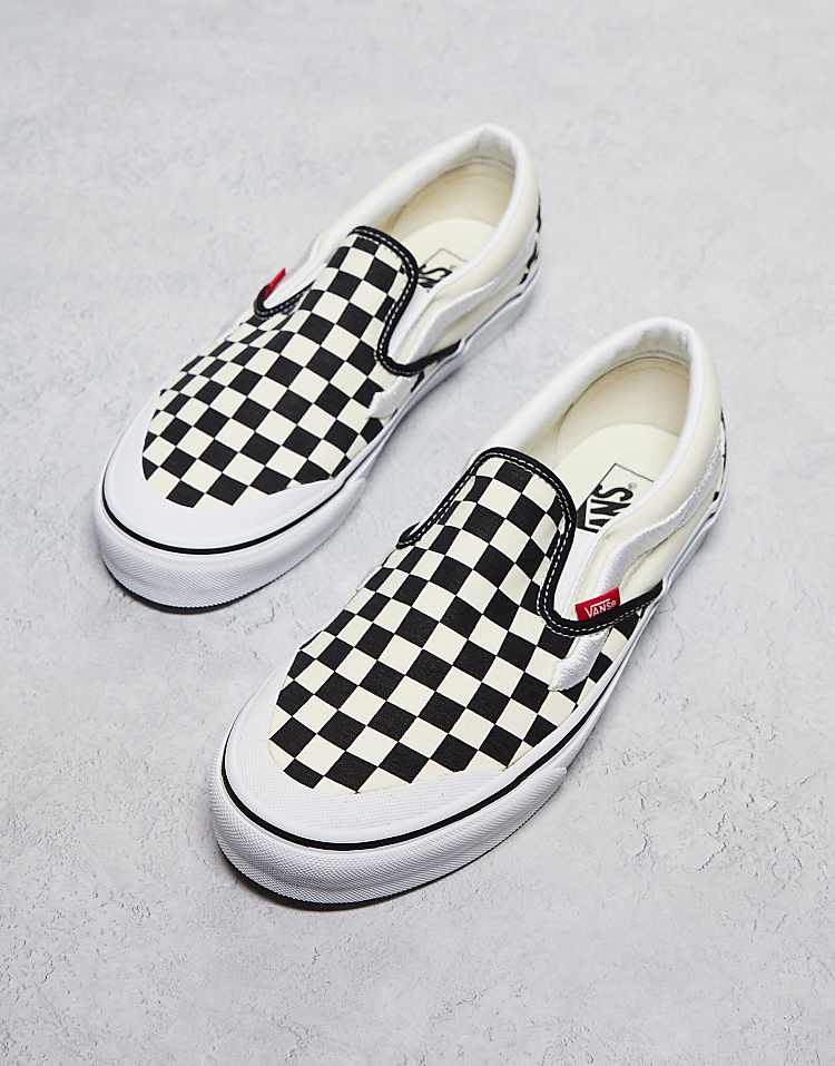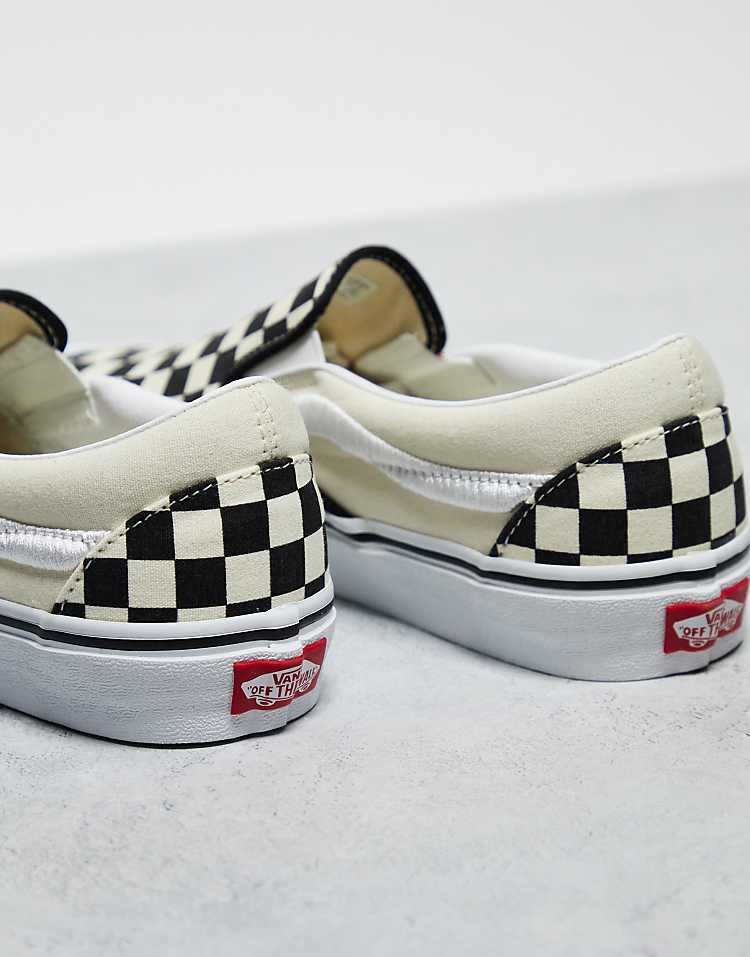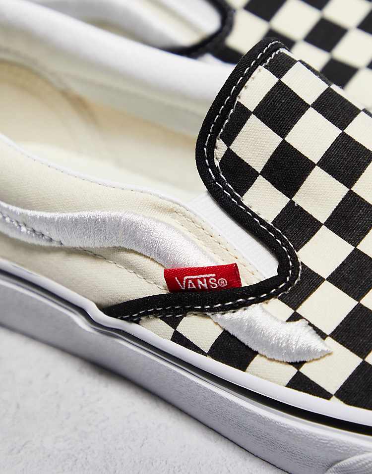 Вансы слип он кеды белые с характерным черно-белым принтом в клетку и фирменной белой полосой на бортике.