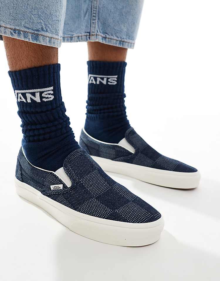 Кеды Vans Classic Slip-On в дениме синего цвета с фирменным клетчатым принтом — идеальная модель для повседневной носки. Эта классика от бренда Vans отличается низким профилем, эластичными вставками по бокам для удобства надевания и мягкой манжетой вокруг щиколотки для комфорта. Узнаваемый логотип Vans и фирменная вставка ‘Off The Wall’ на заднике подчеркивают аутентичность модели. Кроссовки без шнурков оснащены высококачественной резиновой подошвой с характерным вафельным протектором для надежного сцепления и долговечности.