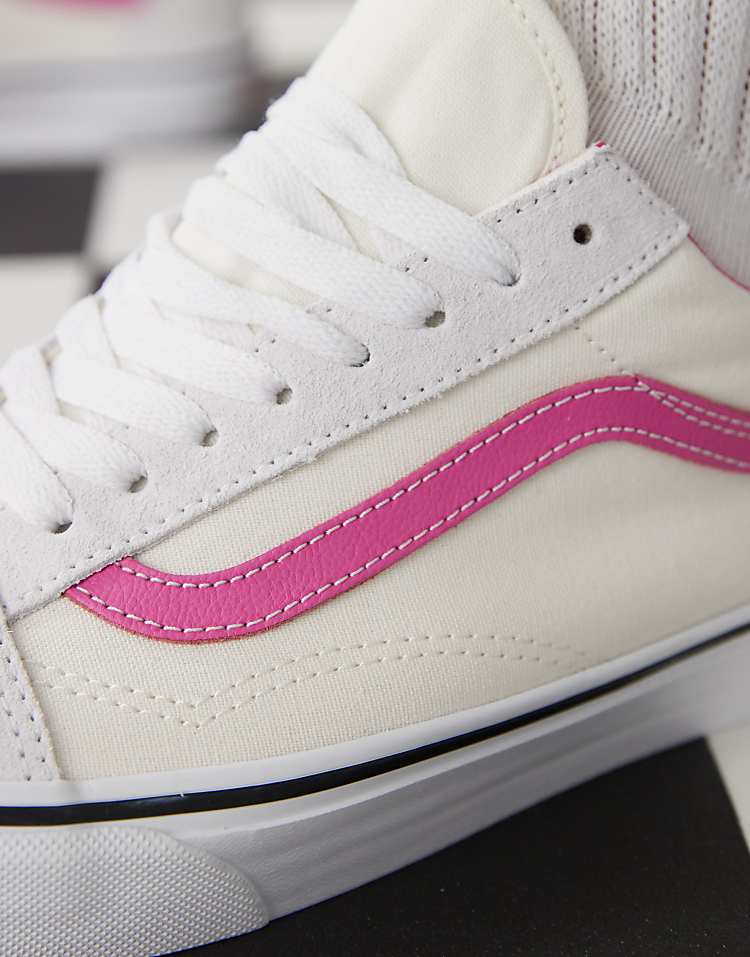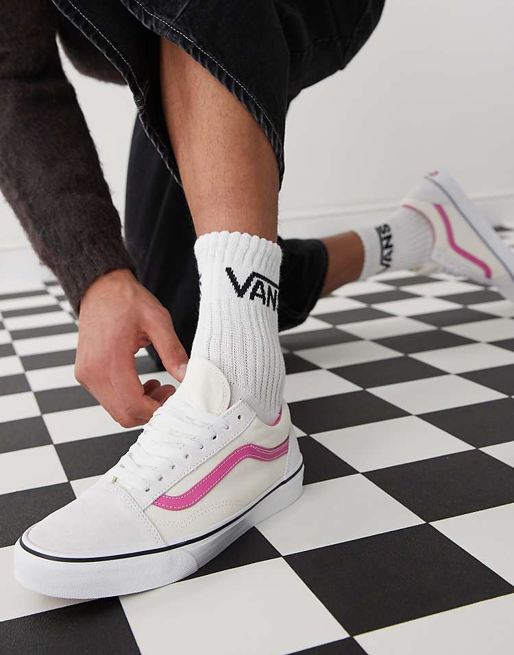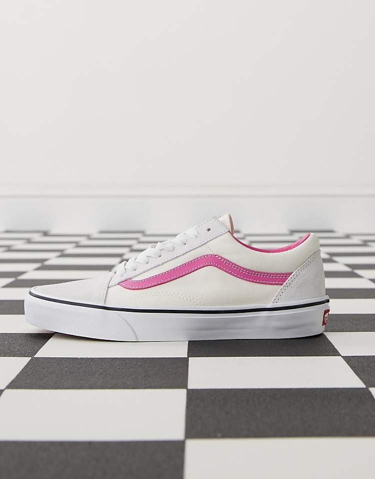 Универсальные кеды Vans Old Skool — настоящая классика скейтерской культуры, которую с удовольствием носят как ценители уличного стиля, так и любители повседневной удобной обуви. Модель выполнена из прочного белого полотна, а розовые акценты на боковых сторонах и фирменная полоска «в клетку» добавляют образу свежести и индивидуальности. Эти вансы станут идеальным выбором для тех, кто ищет стильные кеды с характером.
